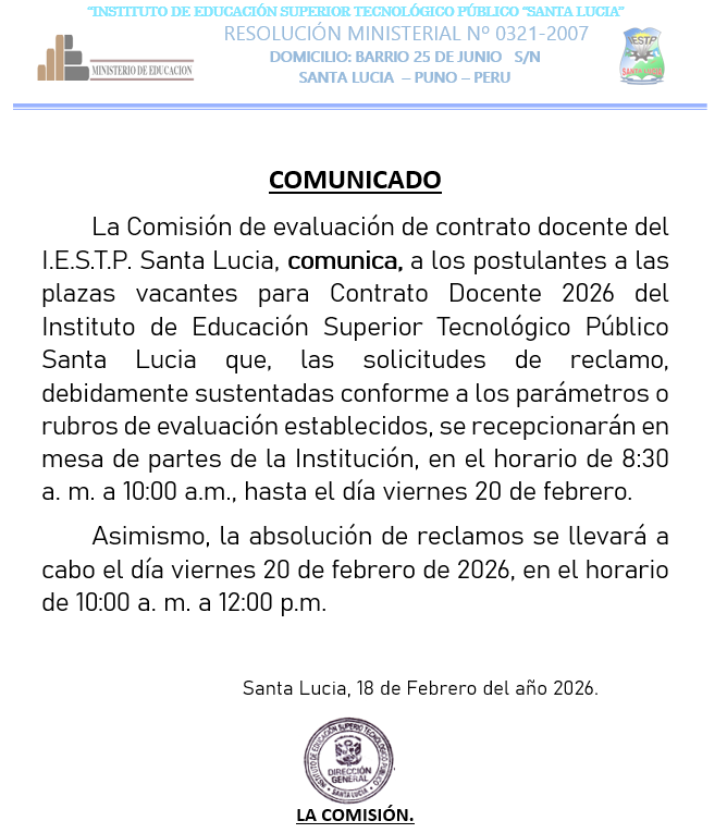 00110022Tecnologico Santa LuciaRumbo al Licenciamiento Biblioteca Virtual Para nuestros estudiantes + Beneficios Para nuestros estudiantes Bolsa Laboral Para nuestros estudiantes y Egresados Noticias y Comunicaciones COMUNICADO Resultados preliminares del concurso público de méritos abierto de docentes regulares 2026 Resultados preliminares del concurso público de méritos abierto de docentes regulares 2026 – PA JURAMENTACION DEL CONSEJO DE ESTUDIANTES PERIODO 2025 El IESTP «SANTA LUCIA», el día de hoy 14 de julio del presente año, se realizó la juramentación de los representantes del Consejo Estudiantil. 𝐕𝐢𝐬𝐢𝐭𝐚 𝐓é𝐜𝐧𝐢𝐜𝐚 𝐝𝐞𝐥 𝐆𝐨𝐛𝐢𝐞𝐫𝐧𝐨 𝐑𝐞𝐠𝐢𝐨𝐧𝐚𝐥 𝐝𝐞 𝐏𝐮𝐧𝐨 𝐚𝐥 𝐈𝐄𝐒𝐓𝐏 𝐒𝐚𝐧𝐭𝐚 𝐋𝐮𝐜í𝐚 𝐩𝐚𝐫𝐚 𝐄𝐯𝐚𝐥𝐮𝐚𝐫 𝐂𝐨𝐧𝐬𝐭𝐫𝐮𝐜𝐜𝐢ó𝐧 𝐝𝐞 𝐈𝐧𝐟𝐫𝐚𝐞𝐬𝐭𝐫𝐮𝐜𝐭𝐮𝐫𝐚 𝐄𝐝𝐮𝐜𝐚𝐭𝐢𝐯𝐚 El equipo técnico del Gobierno Regional de Puno realizó una visita oficial al local del Instituto de Educación Superior Tecnológico Público (IESTP) Santa Lucía.